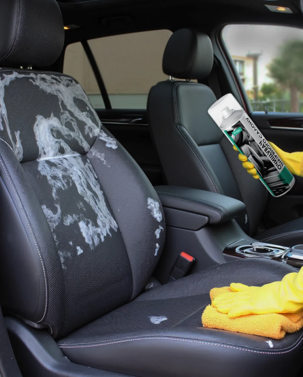 Замість розпилювати піну відразу на все сидіння, розділіть поверхню на зони. Це допоможе контролювати час витримки й рівномірно знімати засіб. - Приділіть увагу швам і складкам.